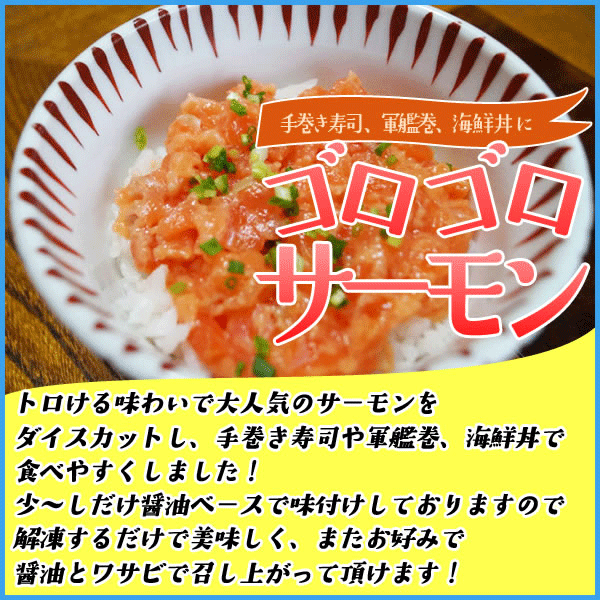 商品 ゴロゴロサーモン 原材料:サーモントラウト(チリ産)、食塩、しょうゆ、トレハロース、調味料(有機酸等)、pH調整剤、酸味料、膨張剤、酸化防止剤(V.C、カテキン)、(原材料の一部に小麦を含む) 保存方法:-18℃以下で保存 内容量:42g×8パック ※賞味期限に関してのご注意 各商品のパッケージには個別の賞味期限が記載されているものがございますが、お届けした外箱に添付されたシールに記載されている当店の賞味期限とは異なる商品がございます。