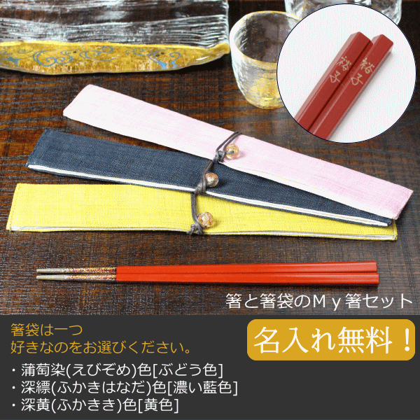 My箸セット 京都仕立て箸袋「みやびのそめいろ」+「華正工房 箸 朱 食洗機対応」加賀の手描き蒔絵名入れ無料!(うるしけんこう箸 食洗機対応 五角 朱)[和食器 ギフト 誕生日祝 退職祝 山中漆器 加賀蒔絵]