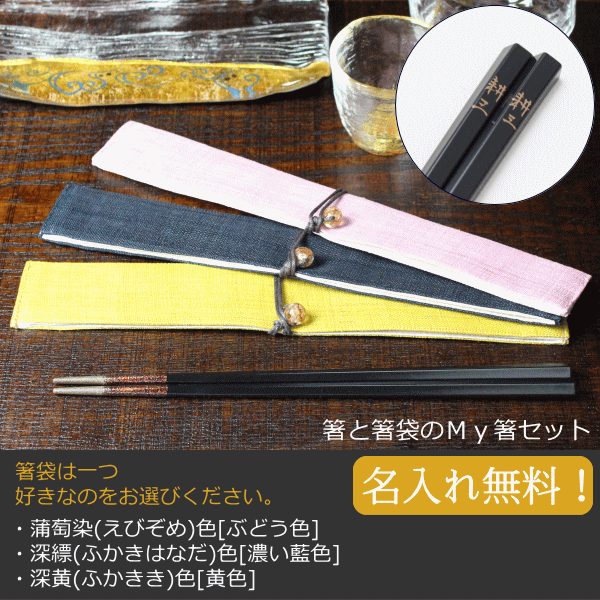 My箸セット 京都仕立て箸袋「みやびのそめいろ」+「華正工房 箸 黒 食洗機対応」加賀の手描き蒔絵名入れ無料!(うるしけんこう箸 食洗機対応 五角 黒)[和食器 ギフト 誕生日祝 退職祝 山中漆器 加賀蒔絵 父の日]